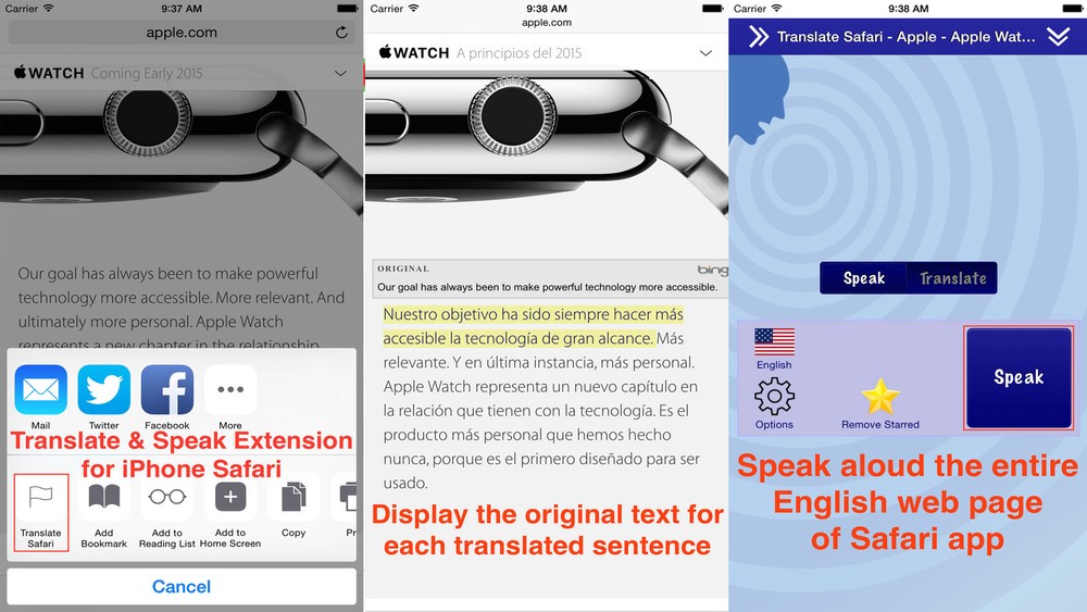 Translate for Safari é uma extensão para o navegador do iOS, que ajuda o usuário ao traduzir parágrafos ou páginas inteiras com facilidade. Além da tradução por texto, o aplicativo traz, através de compras in-app, tradução com narração em mais de 70 idiomas.